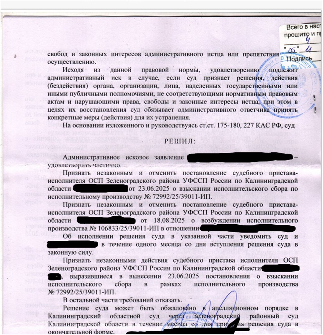 В итоге, решением Зеленоградского районного суда Калининградской области административный иск нашей доверительницы был удовлетворен частично. Суд, кроме прочих удовлетворенных требований, признал незаконным и подлежащим отмене постановление о взыскании исполнительского сбора.